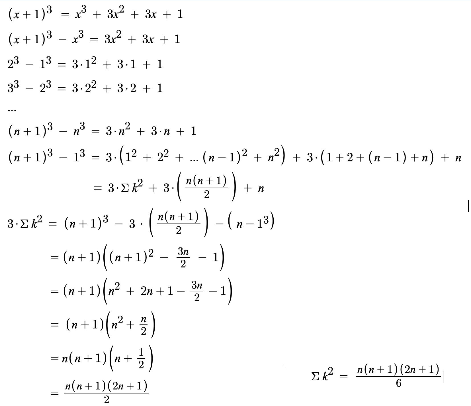1부터 N까지 제곱의 합은 다음과 같이 유도할 수 있습니다.
