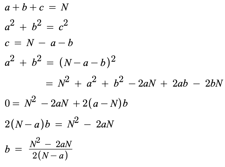 피타고라스 수를 얻기 위해 이중 반복문을 써도 되지만 아래와 같은 식을 통해 n과 a가 있을 때 b를 구할 수 있습니다.