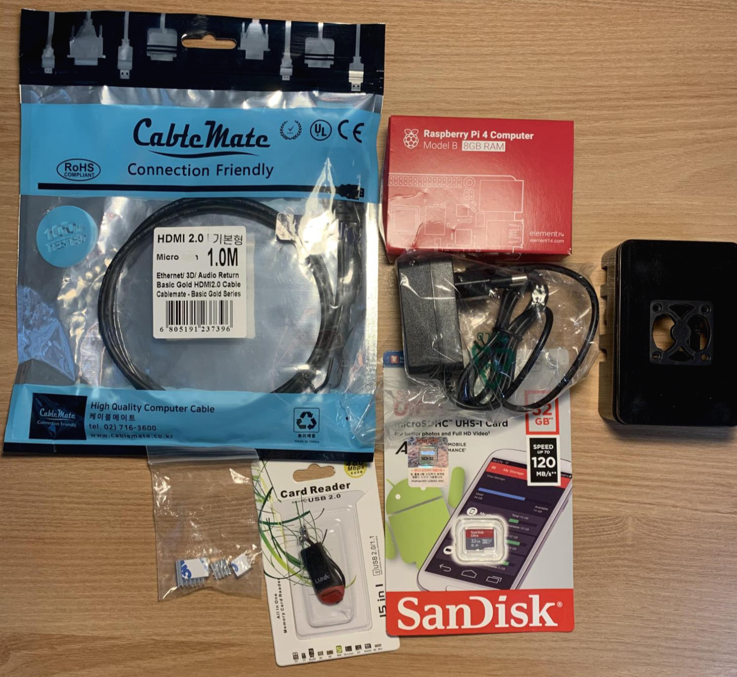 구매한 건 본체, 케이스, 마이크로SD카드, 카드 리더, MicroHDMI to HDMI 케이블입니다.