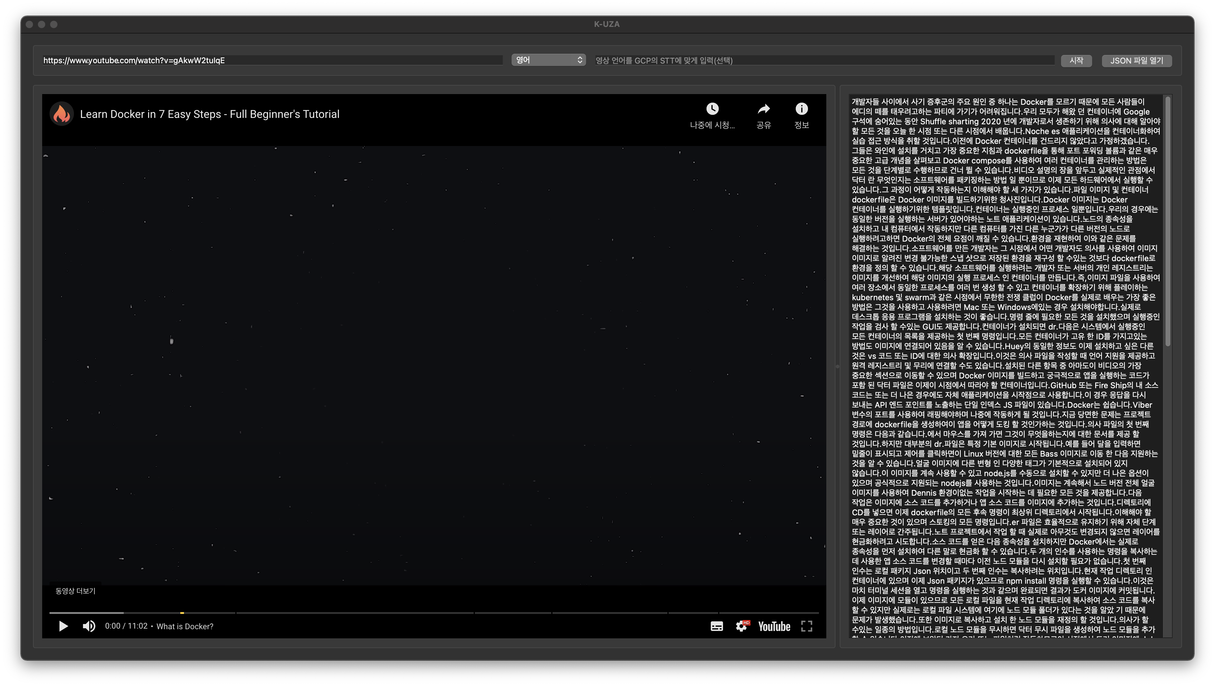 K-UZA(이하 쿠자)는 저를 포함한 6명이 함께한 프로젝트로 GCP의 STT와 번역 기능을 활용한 유튜브 자막 추출 프로그램입니다.
