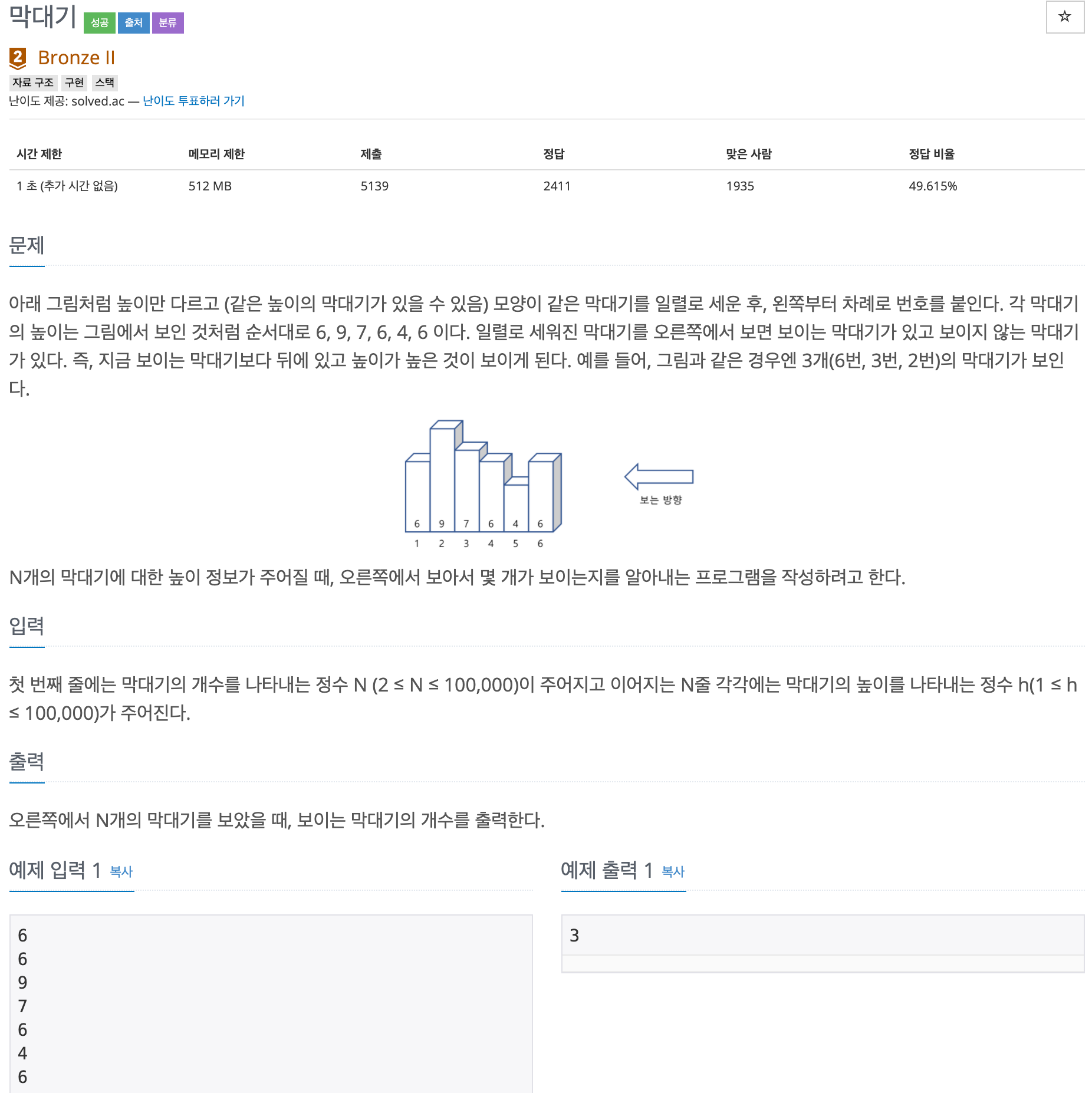 우선, 가장 오른쪽의 막대기, 즉, 마지막 인덱스의 막대기는 무조건 보이므로 이를 max값으로 잡고 왼쪽으로 하나씩 이동하며 만약 이 max값보다 막대기의 길이가 더 크면 max를 업데이트하고 보이는 막대기 개수(cnt)를 1 증가시킵니다.