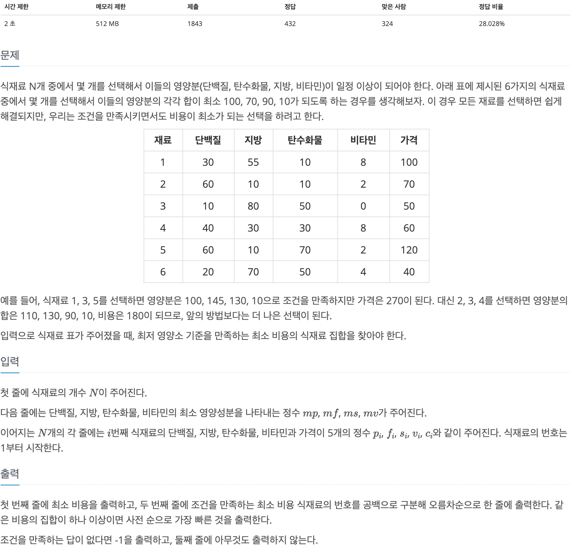 마지막에 최소 비용이 없데이트 되지 않았다면 -1을 아니면 최소 비용과 선택한 영양소들을 출력합니다.