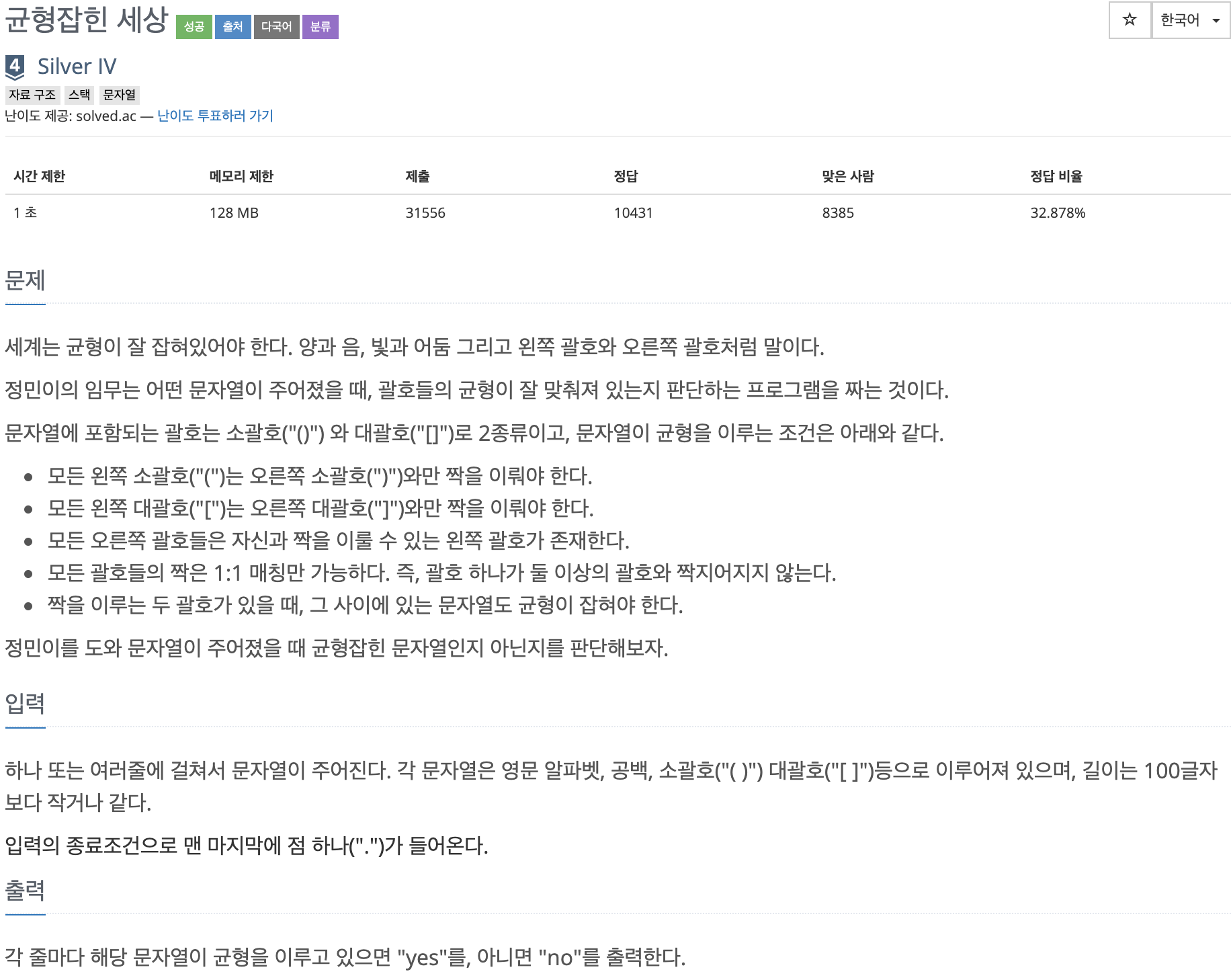 이 문제는 간단한 스택 문제로 뭘 스택에 넣고 뭘 무시하면 되는지 파악하면 간단히 풀 수 있는 문제입니다.