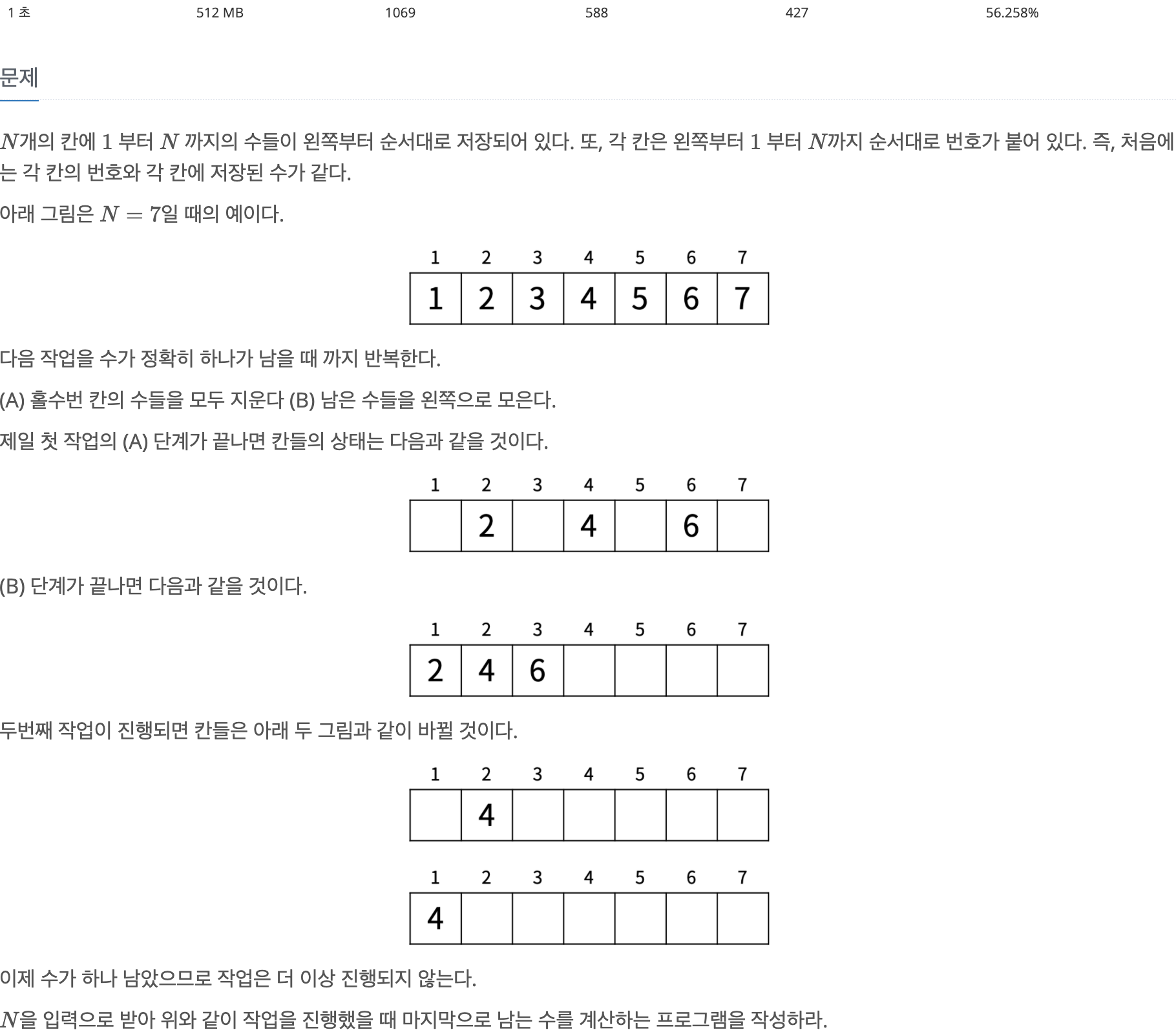 그 후에도 결국 절반으로 나누는 연산을 계속하기 때문에 결과적으로 2의 제곱수가 답이 됩니다.