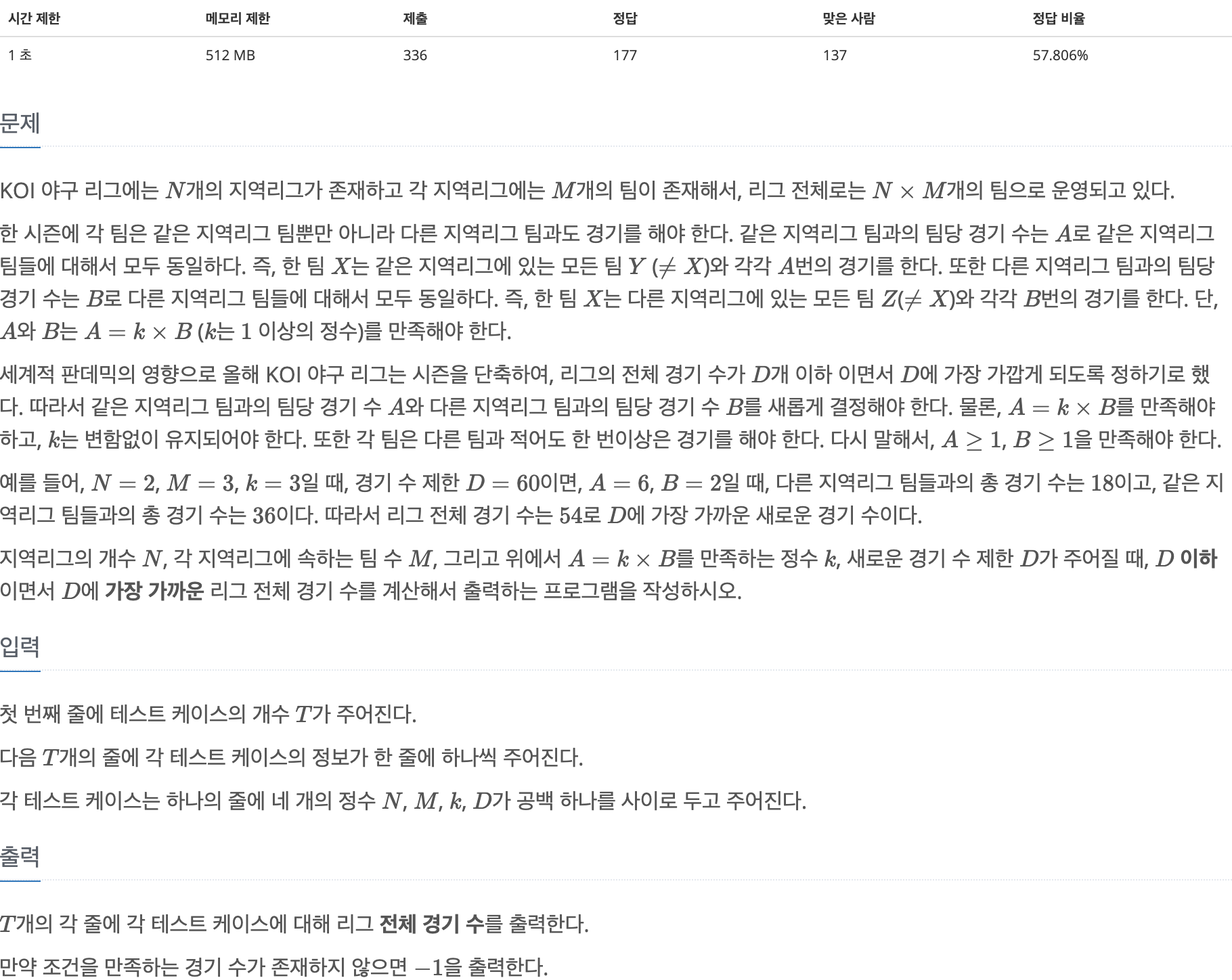 그렇기에 B의 값을 한 번에 구할 수 있으며 만약 B가 0이하가 아니라면 구한 B를 통해 위 식을 계산할 값을 출력하면 되고 0 이하라면 -1을 출력하면 됩니다.