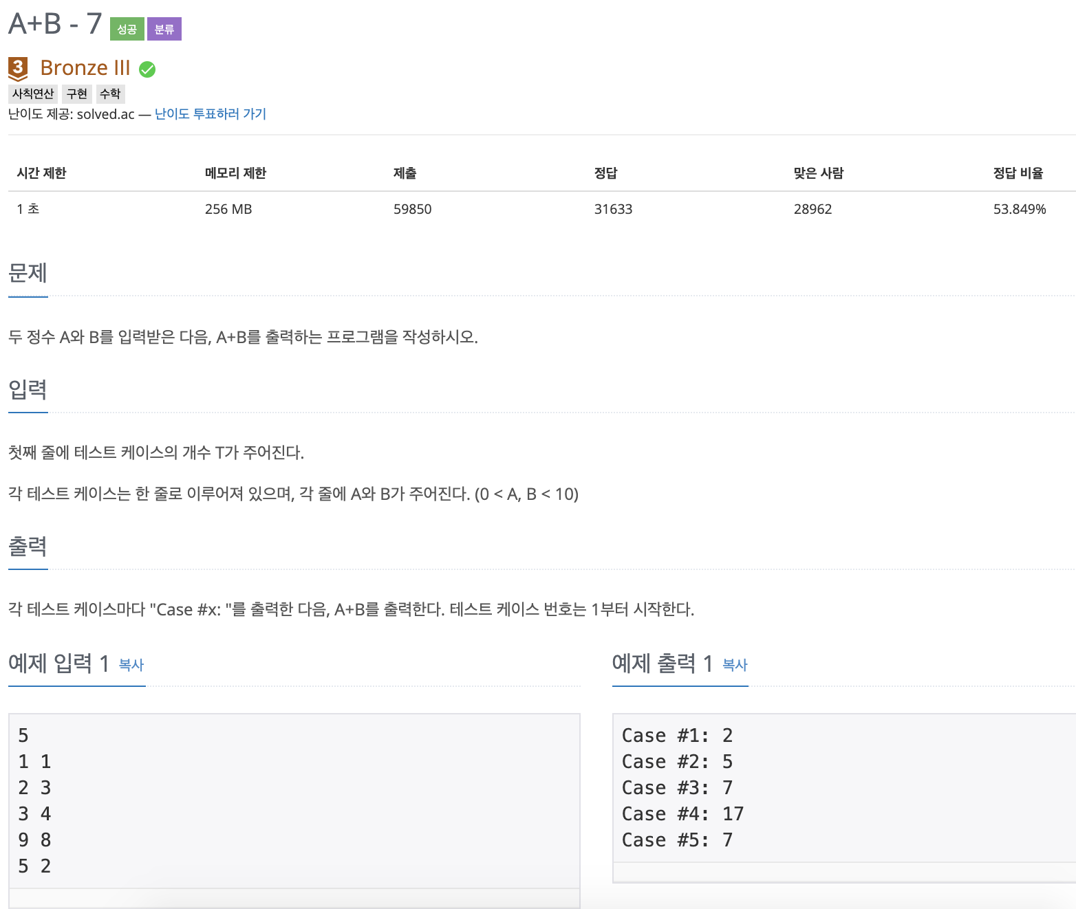 이 문제는 다른 A+B와 유사하지만 해당 덧셈이 몇 번째 덧셈인지 출력을 해 아름다운 출력을 하는 문제입니다.