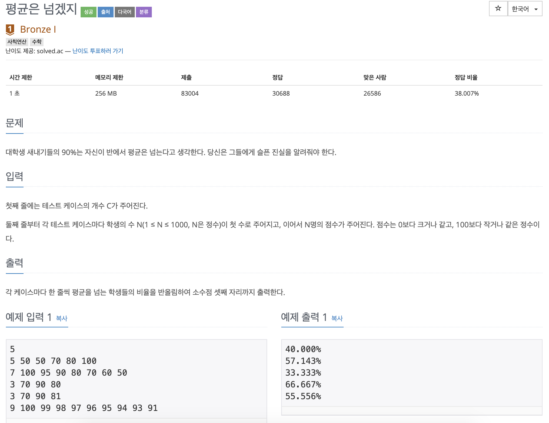 첫 번째 줄을 제외한 각 줄에서 평균을 구한 다음 평균보다 점수가 높은 사람의 수를 구하는 문제이다.