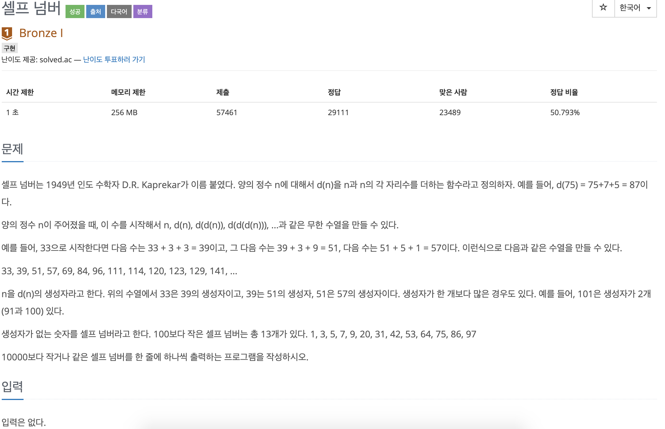 그러므로 1부터 10000까지의 수를 가진 집합에서 위의 집합을 빼면 셀프 넘버들로만 이루어진 집합이 만들어집니다.