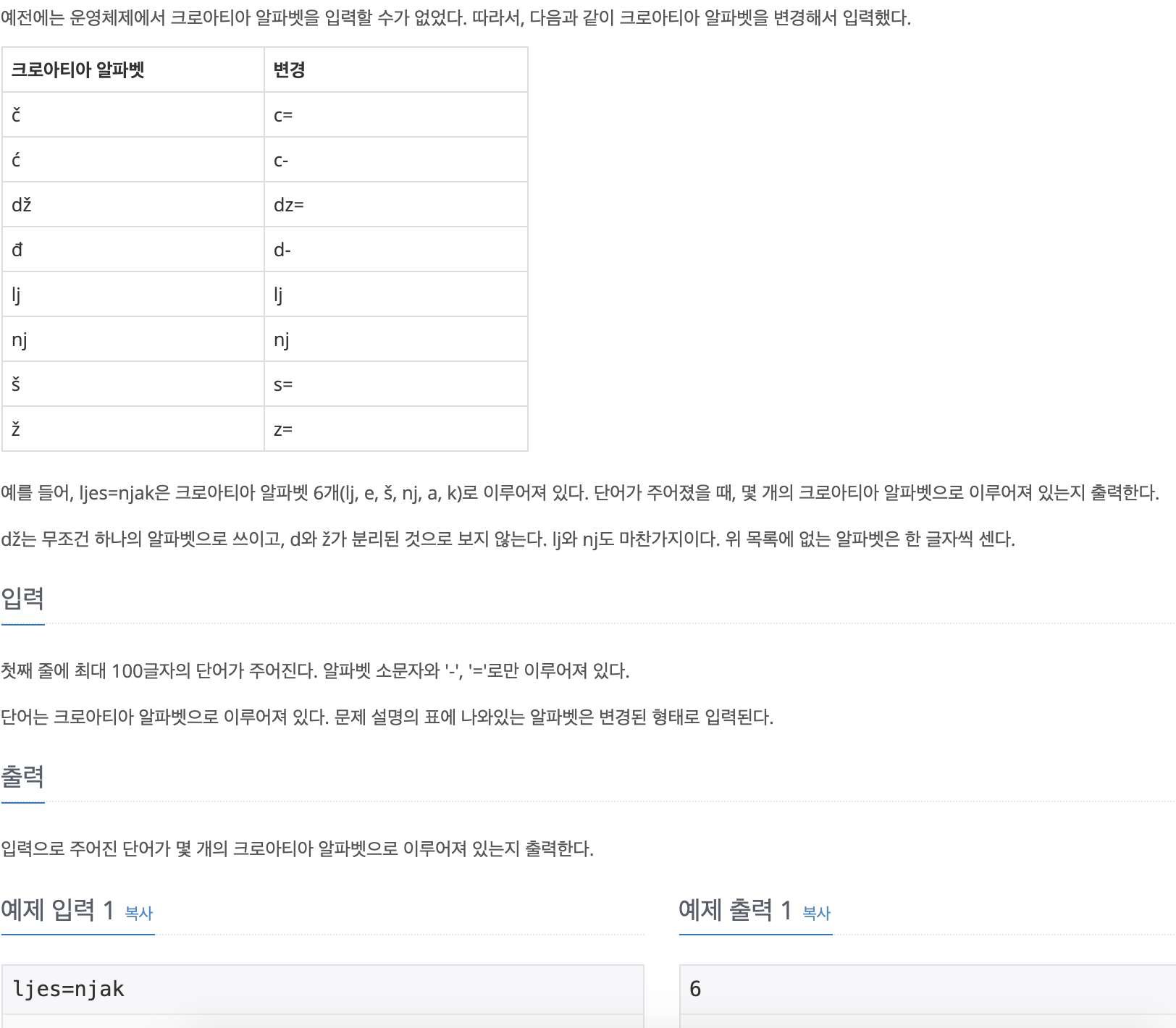 문제는 크로아티아 알파벳의 개수를 출력하라고 요구하므로 크로아티아 알파벳의 특이 문자들을 아무 문자 하나로 각각 바꿔주고 그 길이를 출력하면 됩니다.