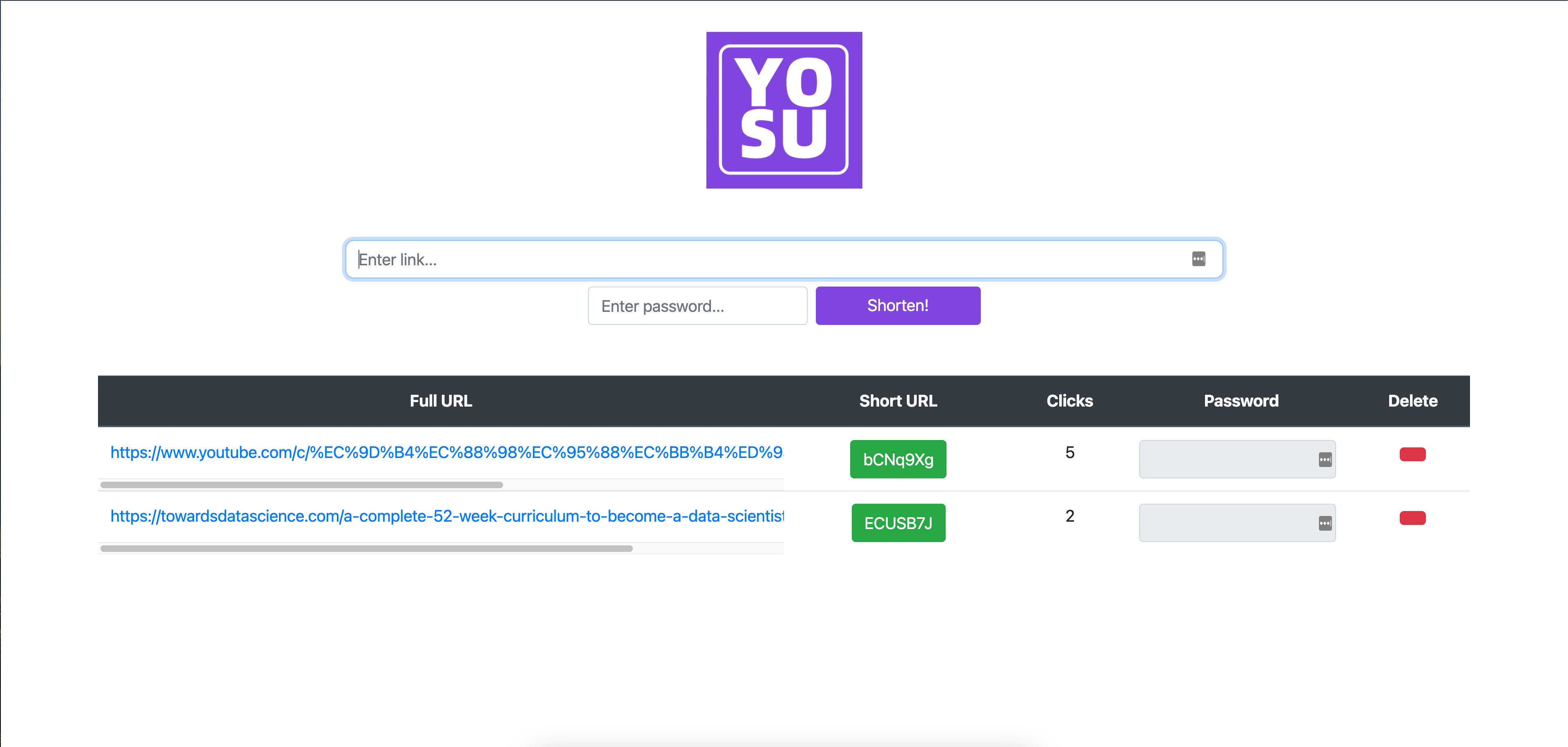 HTML 파일은 간단하게 줄일 링크를 넣을 form이랑 현재 디비에 있는 것들을 간단히 관리할 수 있는 테이블을 넣었습니다.