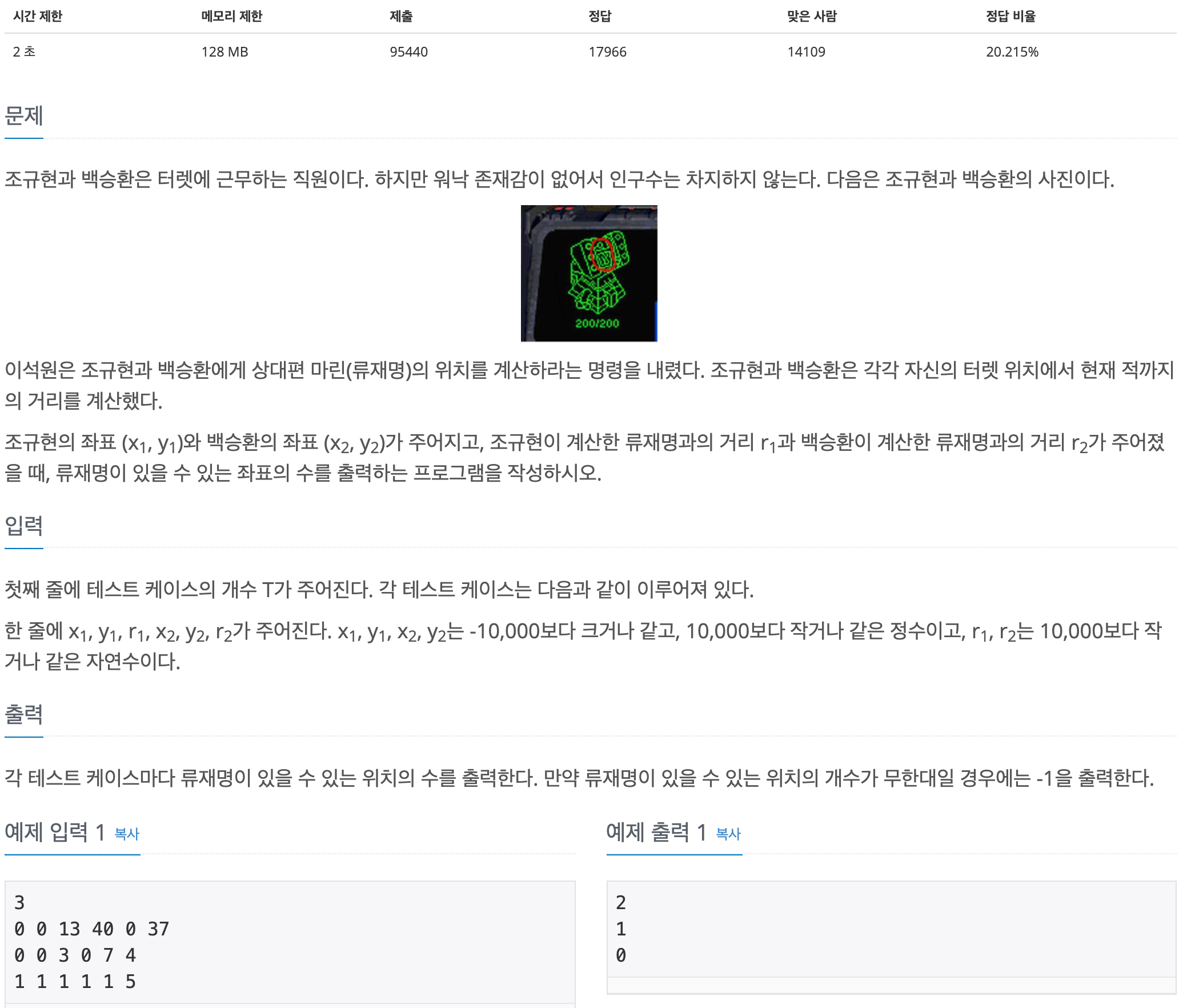 이때, 이 두 원의 교점이 적의 위치가 되기 때문에 교점의 개수가 답이 됩니다.