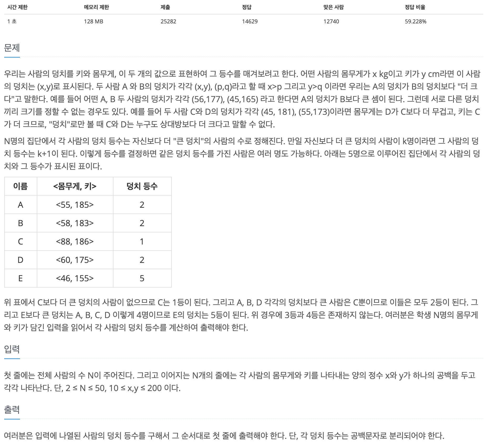 덩치 등수는 자기보다 덩치가 큰 사람들의 수 + 1이므로