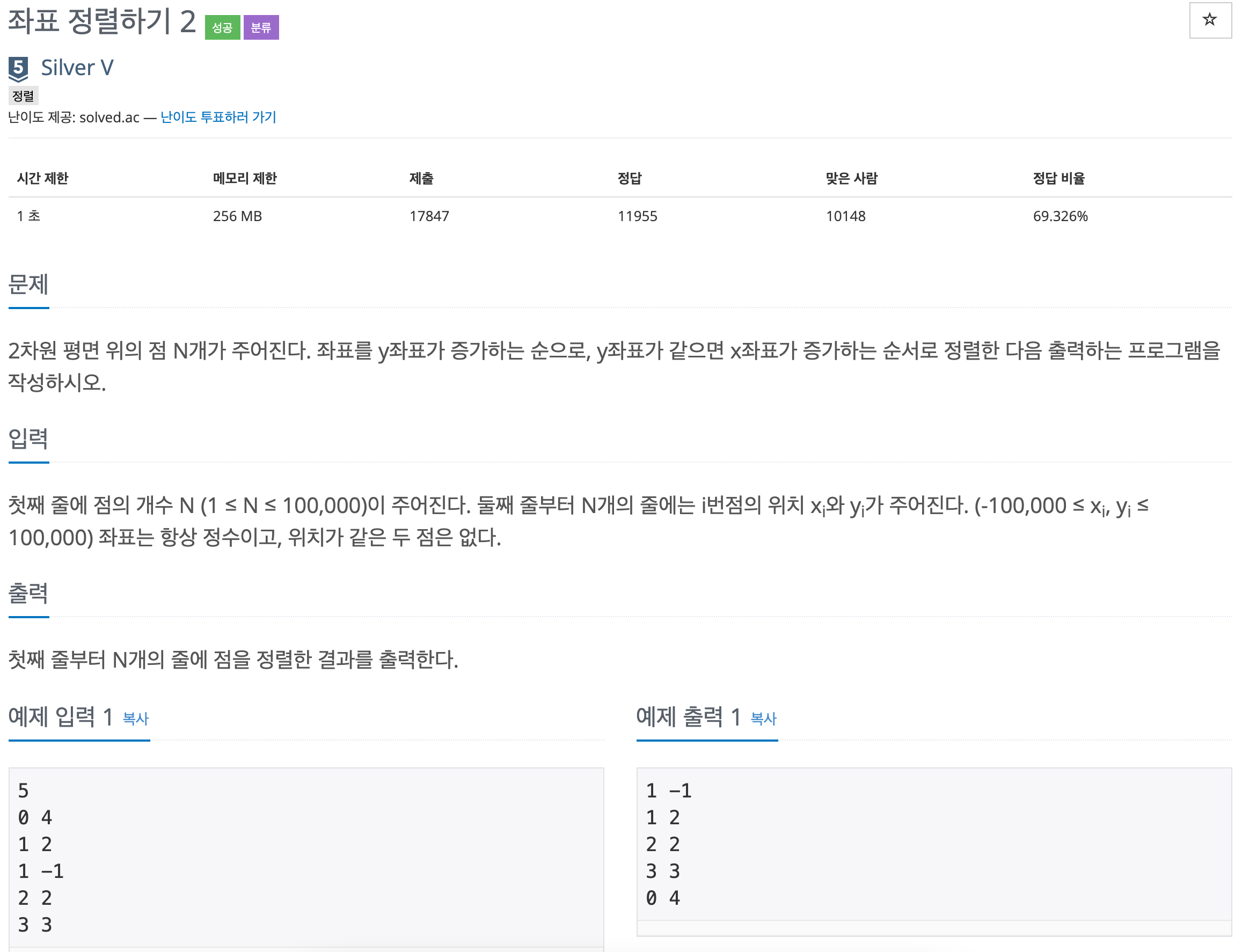 이 문제는 11651의 좌표 정렬하기와 비슷한 문제로 입력량이 많아 sys모듈을 사용하고 뒤에 key를 통해 2번째 숫자를 기준으로 정렬하되 같은 값이 있다면 첫 번째 값이 더 작은 순으로 정렬한다.